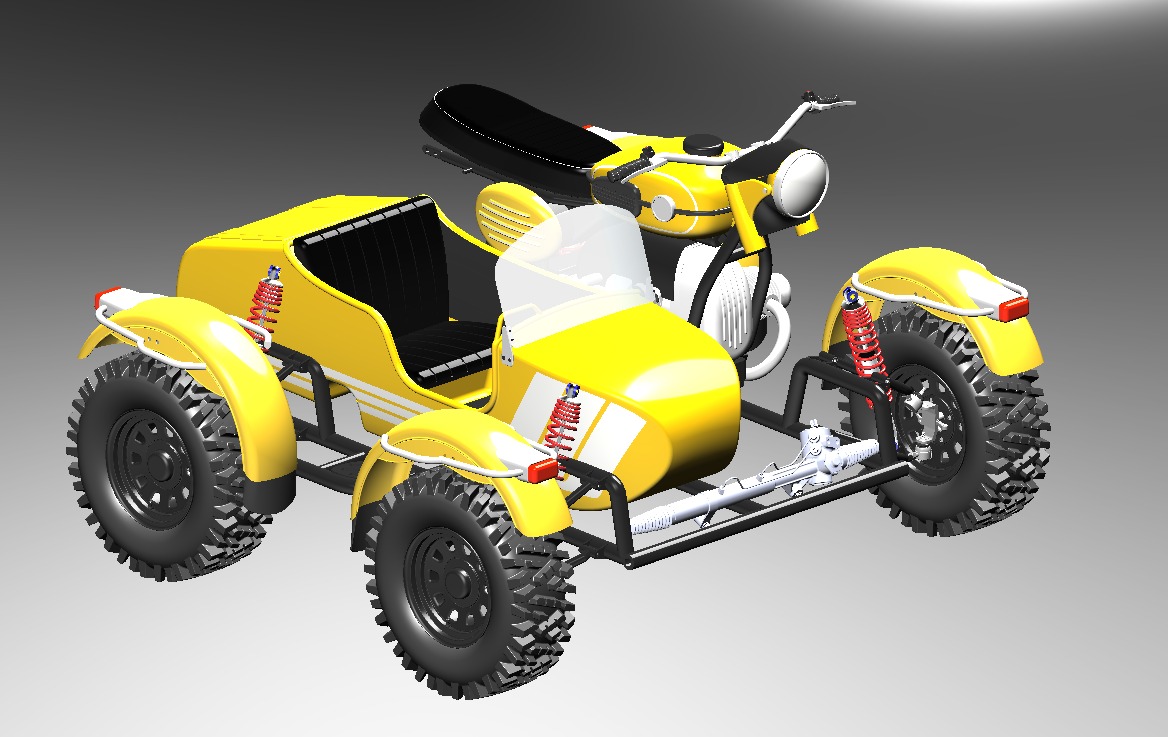 mechanik71 писал(а): Пн июл 19, 2021 10:19 pm И тут меня осенило - на незаконченных рисунках не нарисован привод задних колёс и Вы видите странный мотоцикл с коляской на четырёх колёсах! Это несколько не так! Задние колёса - ведущие, так же ничто не мешает использовать полный привод. Передние, как и задние колёса расположены на одной оси. Передние колёса - поворотные. То, что на рисунках нарисован "Урал" - так это от того, что нарисовать, вернее найти в 3-д каталоге, что то похожее на мою идею не удалось.Сможете вместо мотоцикла слева от коляски представить квадр без правых крыльев? Я могу, но нарисовать - увы, нет.