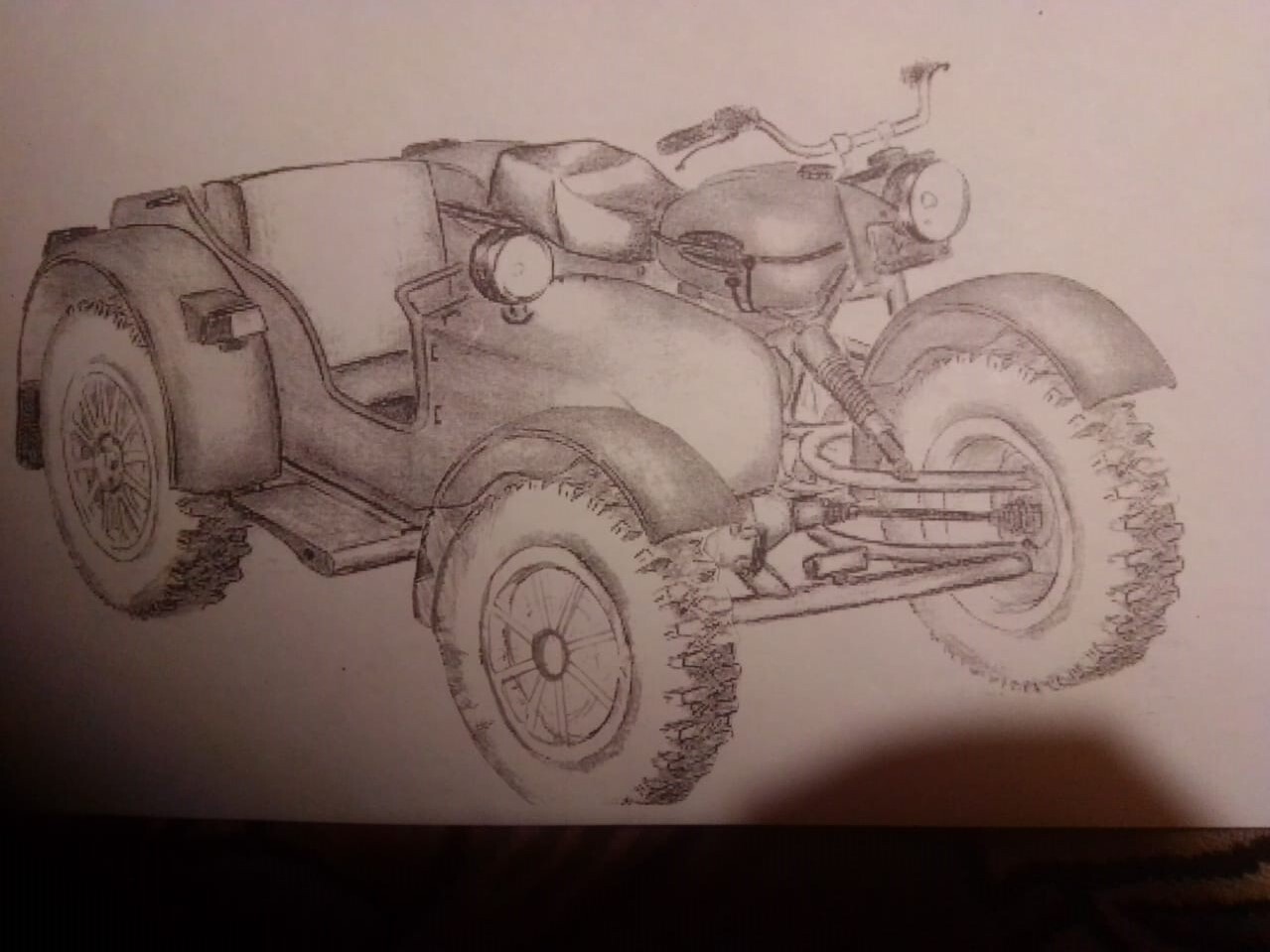 Весьма интересная идея, но думаю логичнее будет развить тему Урала с ведущей коляской. Часть трансмиссии можно оттуда же использовать, колесо коляски сдвинуть назад, надо только придумать передний ведущий мост.