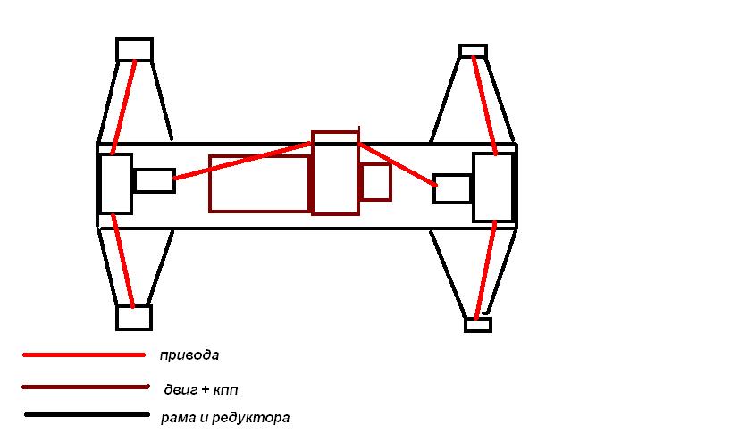 у меня передний редуктор немного повернут относительно продольной оси.задний смещен назад.