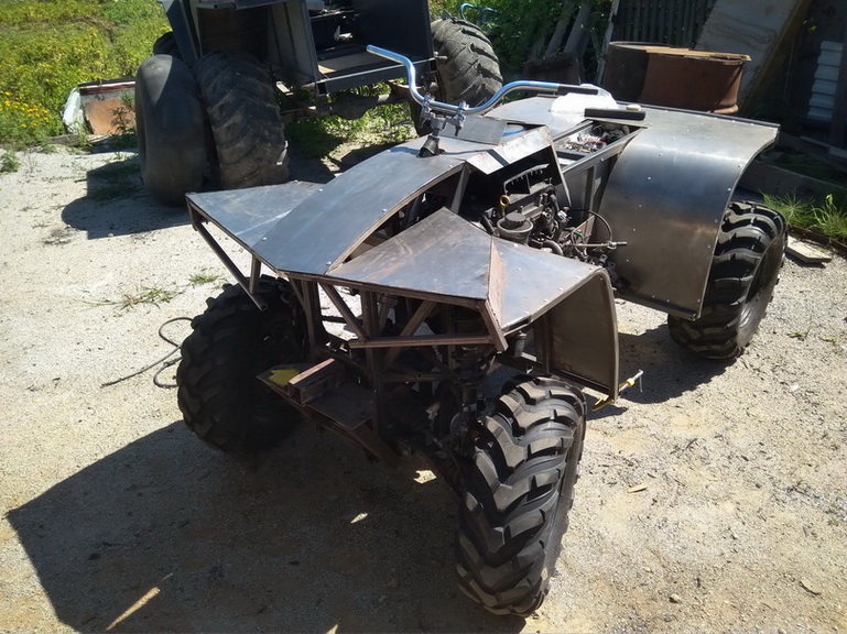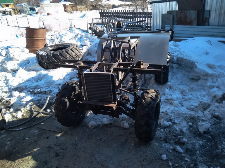 На форуме в последнее время совсем нет новых проектов. Хочу поделиться своим. Сразу оговорюсь, что процесс строительства будет описан в прошлом времени, т.к. квалрик уже построен и вовсю эксплуатируется. Итак, в 2014 был построен первый квадрик на базе Оки, как и у многих. Вот тема http://buggy-plans.ru/forum/viewtopic.p ... 39#p168939. Довольно быстро был продан, т.к. захотелось чего-то иного. Потом был вездеход, упоминания о нем тоже где-то здесь были. Хороший был вездеход... Но хотелось квадрик, да и батя к первому проекту очень проникся, просил повторить. Короче вездеход был тоже продан. Были мысли и попытки построит аналог Сокола, но не срослось тогда со временем, работой да и хренего знает с чем еще. Короче в 2018 году в январе начачт квадрик. Бюджет на начальном этапе практически не лимитирован был. Да и в процессе строительства особо не экономил. ТЗ было следующее в порядке убывания значимости: отсутствие элементов российского производства, квадрорезина, максимально простая конструкция, минимальный вес, минимум кастомных деталей, подверженных наибольшему износу. Сверх проходимость во главу угла не ставилась, т.к. делалось все для удовольствия, ну и некоторой помощи по хозяйству, к тому же растет пацан, чтоб приобщался к техническому творчеству.
