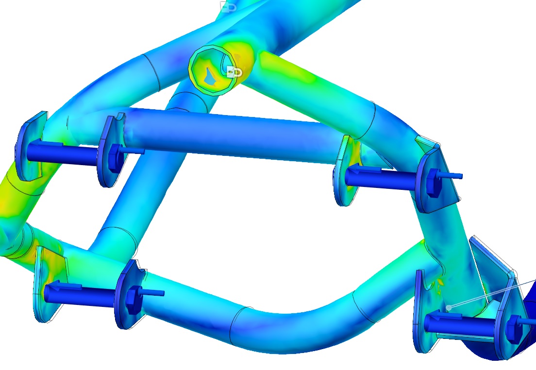 Проектирую многорычажную заднюю подвеску на подрамнике из труб. Прошу совета по поводу расчета нагрузок, приходящихся на точки крепления рычагов. Дело в том, что конструктивно кронштейны крепления рычагов представляют две планки с отверстиями под болт, из 5мм листа ст20, которые приварены к трубе, но никак не связаны между собой (для понимания масштаба радиус скругления внешней стороны пластин 26мм). Одна из которых еще изогнута. Собственно вопрос возник из-за противоречивых данных симуляции нагрузок в cad программе. Точек таких 4 штуки на крепление каждого колеса, машина весит 1500 кг, положение центра масс не известно. Какое примерно значение нагрузки брать за основу, с учетом того что при ускорении, торможении, повороте, вектор и сама нагрузка будет меняться? По моим расчетам, планки не требуется связывать между собой, но визуально конструкция кронштейна кажется хлипкой. Буду благодарен вашему мнению.
